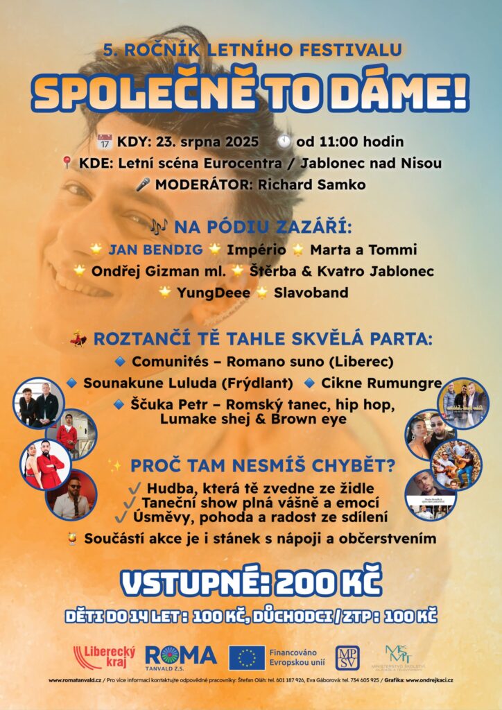 Dne 27. července 2024 se v Jablonci nad Nisou uskutečnil již 4. ročník letního festivalu „Společně to dáme!“ v malebném prostředí Eurocentra na letní scéně. Tento nezapomenutelný den plný hudby, tance a radosti pořádal Spolek Roma Tanvald, a to za finanční podpory z Operačního programu Zaměstnanost a Libereckého kraje.