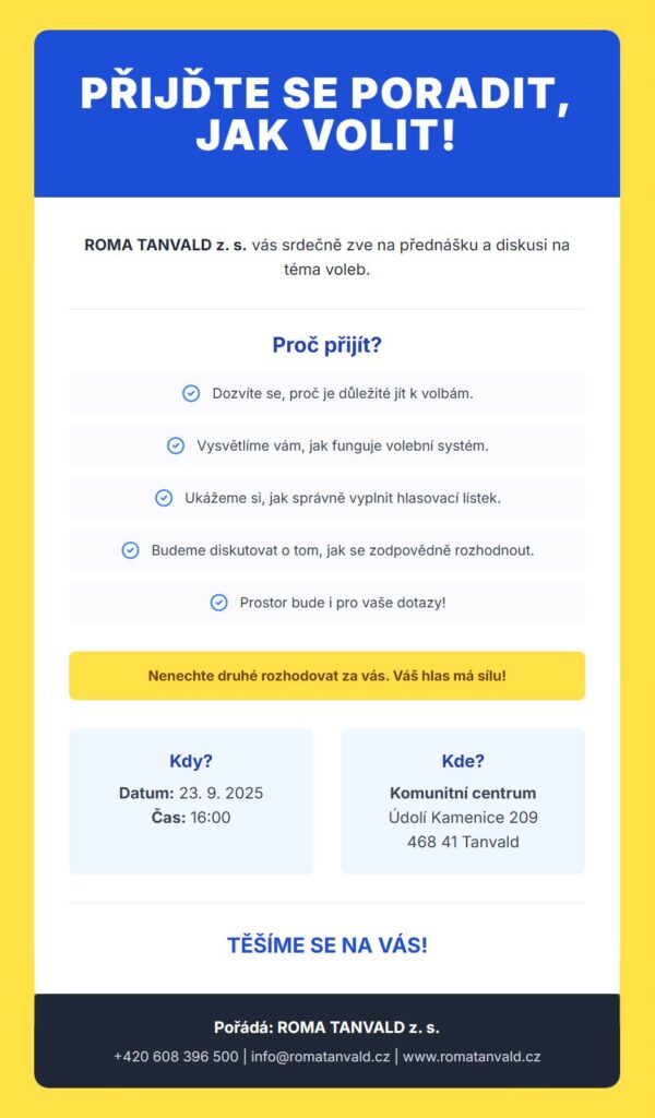 Spolek Roma Tanvald z.s. srdečně zve všechny obyvatele Smržovky, Tanvaldu a Desné k účasti na této akci. Vaše názory, nápady a připomínky jsou velmi cenné a mohou významně přispět k budoucímu rozvoji našich komunit. Přijďte se podělit o své zkušenosti, setkat se se sousedy a společně pracovat na vytváření lepšího a soudržnějšího prostředí pro nás všechny.